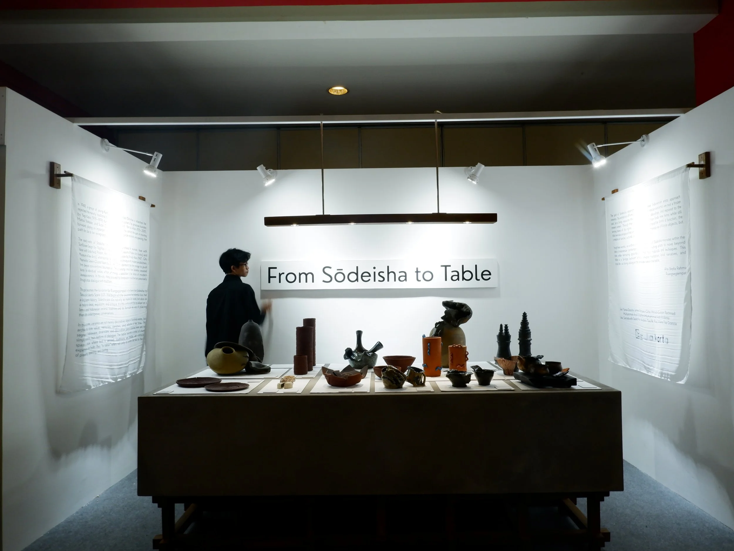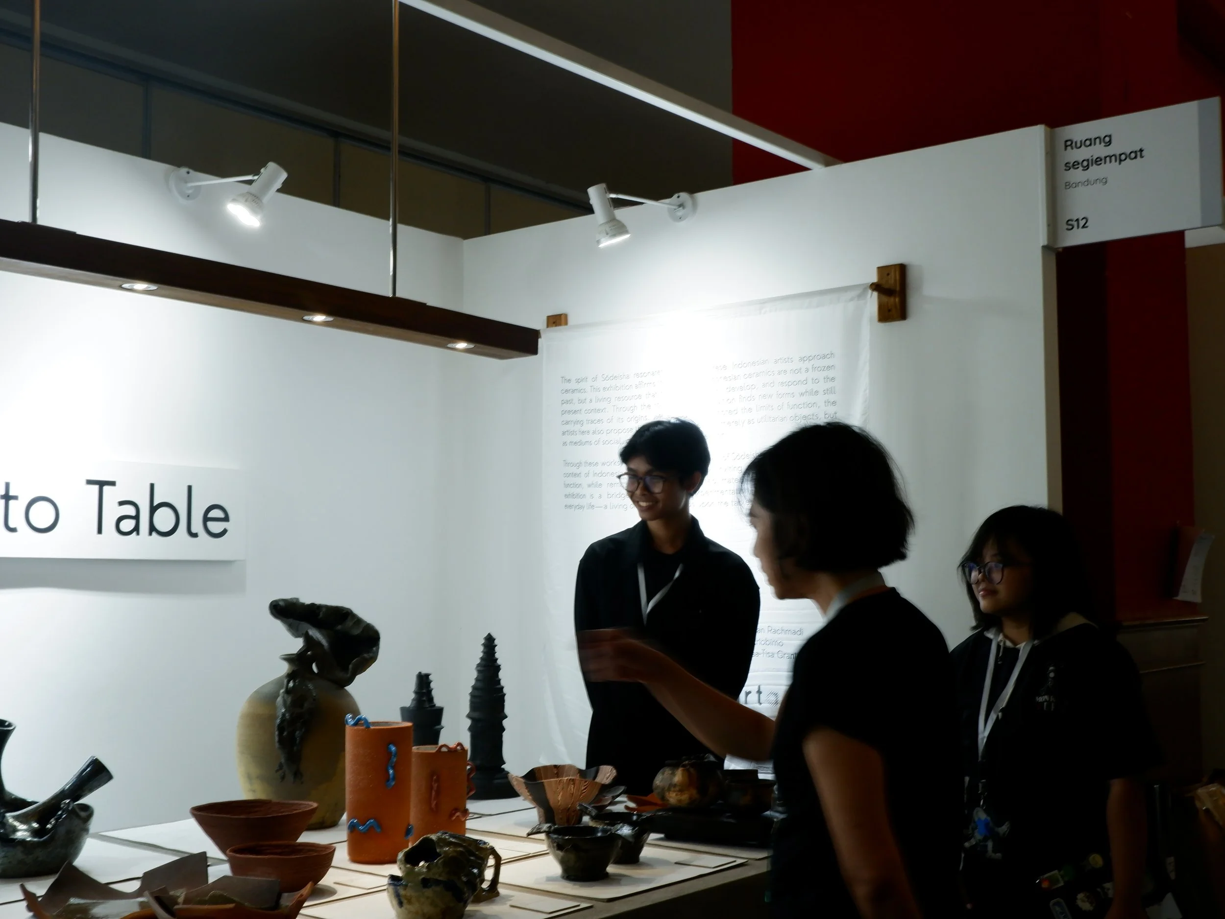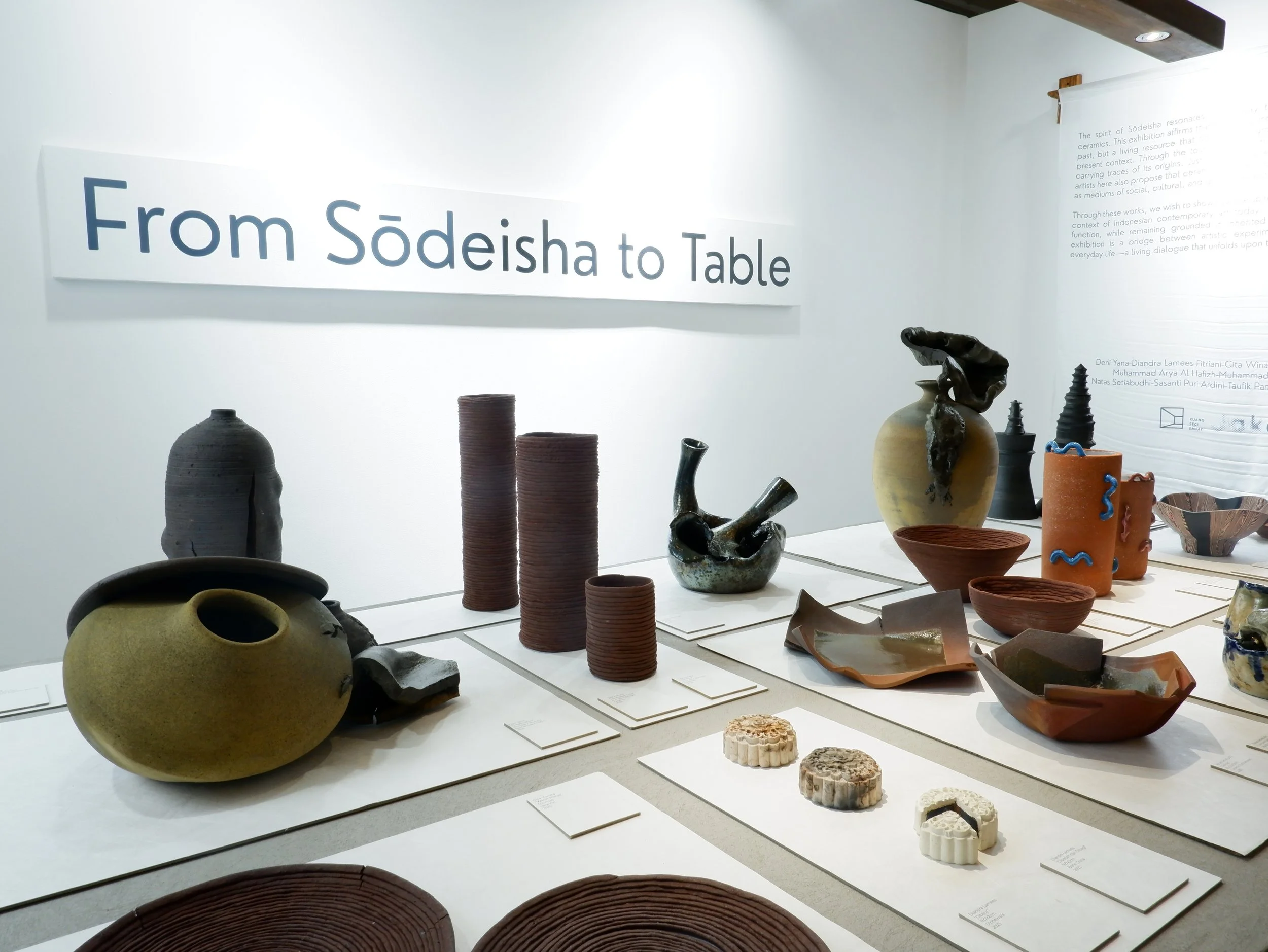 “From Sōdeisha to Table” merupakan pameran keramik yang dihadirkan oleh Ruang Segiempat dalam Art Jakarta Scene 2025, sebagai upaya membaca ulang tradisi panjang seni keramik Indonesia melalui lensa kritis yang terinspirasi dari gerakan keramik avant-garde Jepang, Sōdeisha. Pameran ini menampilkan karya para artisan Deni Yana, Diandra Lamees, Fitriani, Gita Winata, Gustiyan Rachmadi, Muhammad Arya Al-Hafizh, Muhammad Hasbi Ariobimo, Natas Setiabudi, Taufik Panji Wisesa, dan Tisa Granicia, yang menghadirkan eksplorasi tanah liat tidak semata sebagai medium fungsional, tetapi sebagai ruang gagasan, ekspresi, dan dialog kontemporer. Dengan mengadopsi semangat Sōdeisha—sebuah kolektif perajin muda Kyoto yang didirikan pada 1948 oleh Yagi Kazuo dan rekan-rekannya, yang menolak batasan fungsi tradisional tembikar—pameran ini menempatkan praktik keramik Indonesia dalam percakapan lintas sejarah dan budaya, sekaligus membayangkan kemungkinan baru antara tradisi, inovasi, dan praktik artistik masa kini. Narasi kuratorial dan refleksi konseptual pameran ini dipertegas melalui esai yang ditulis oleh Afra Shofia Rahma.